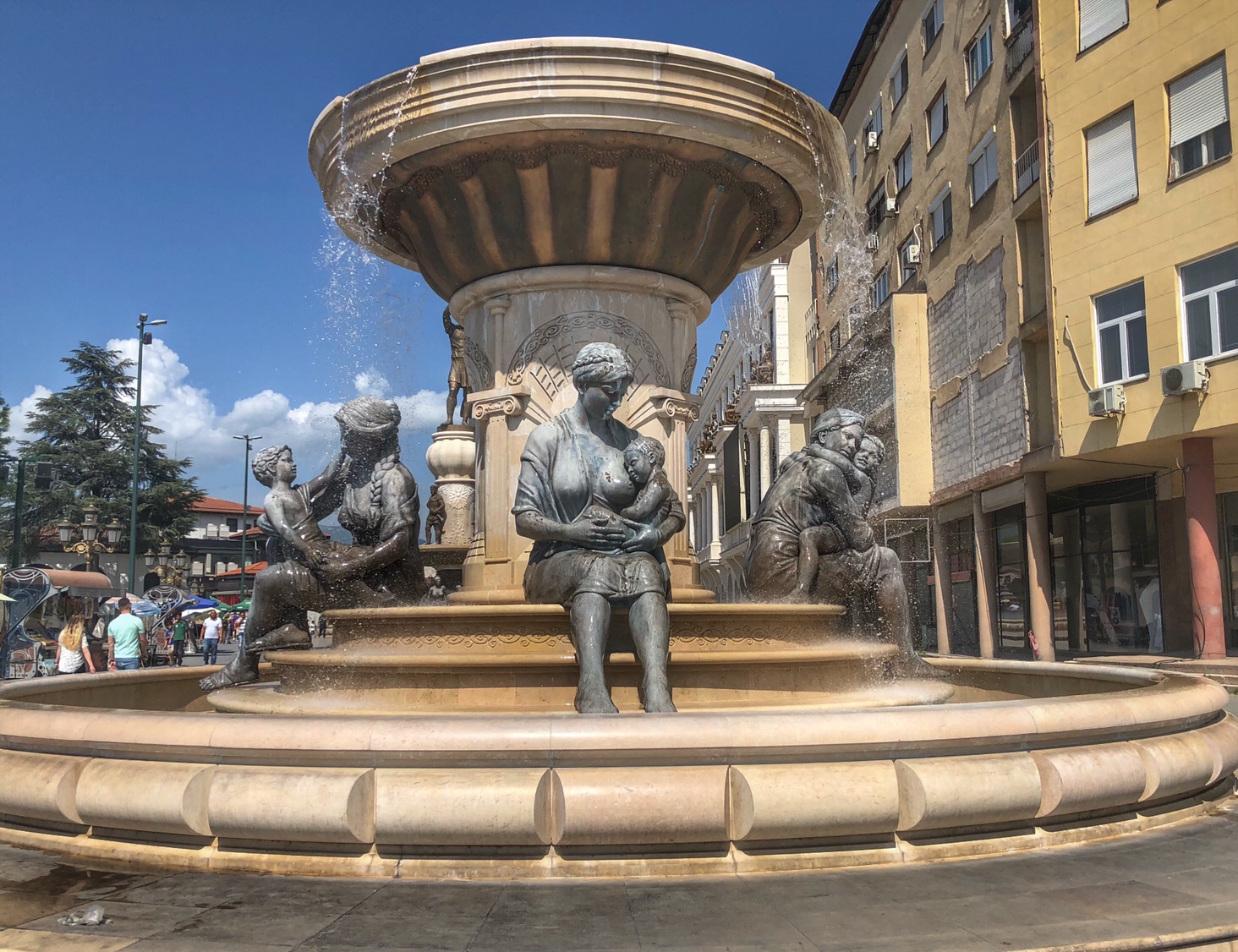 After walking along another street filled with shops and restaurants I see a huge, I mean humongous statue. On the other side of the statue is a huge square, shops restaurants, loads more amazing statues (most statues I’ve ever seen in a city), very little people, a castle and mountains in the background – very cool – not temperature wise it was stinking hot!