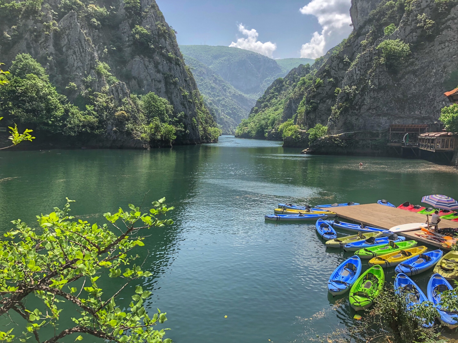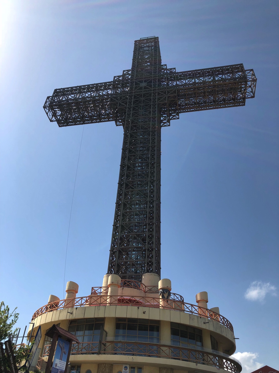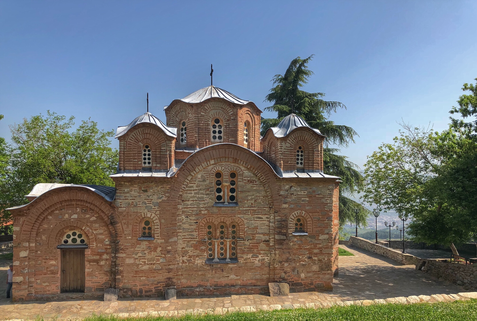 Today, I hired a driver to show me the sights out of town, a couple of German girls from the hostel joined me, a trip up a cable car to an enormous (everything is super-sized) cross on top of the mountain and great views of the city, a visit to a village that has the 14 styles of Macedonian houses – cute, 1164 Monastery – old. Then to Lake Matka and a boat trip on crystal clear water through the Treska Canyon to some caves – relaxing!